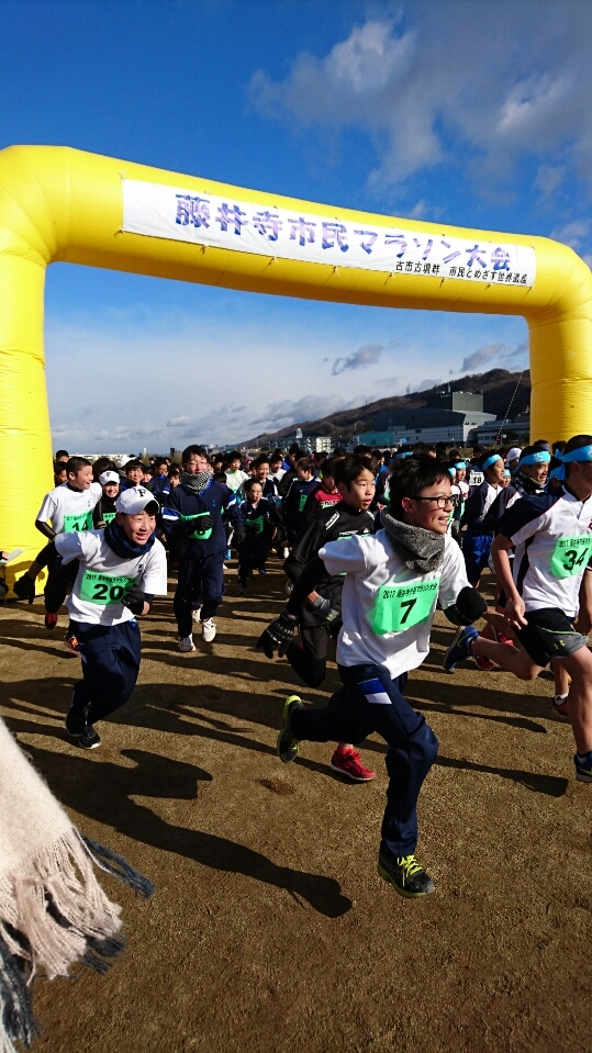 本日朝9時から藤井寺市市制施行50周年記念2017藤井寺市民マラソン大会が船橋河川敷野球場と石川河川敷サイクルロードで行われました。946:名の方々がこの一番の寒波にも負けずに参加され走りを競いました。本当に寒い中でしたが皆さんの素晴らしい走りに感動しました。又このマラソン大会を行うにあたりまして関係者の方々には感謝の思いで一杯です。ありがとうございました。