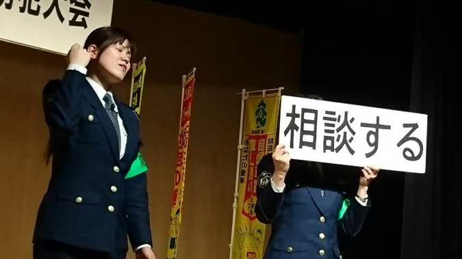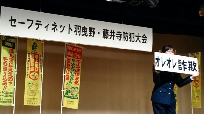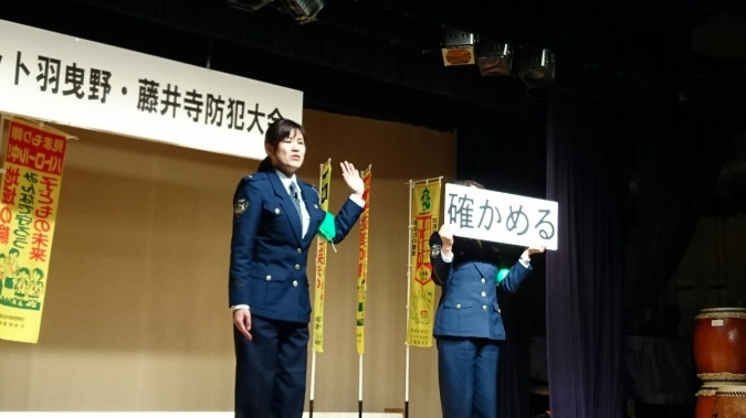 1月28日平成28年セーフティネット羽曳野、藤井寺防犯大会に参加させて頂きました。防犯ボランティア団体表彰のあと大会宣言が行われました。第二部では、大阪府警本部の生活安全指導班による防犯教室がわかりやすいコント形式でやって頂きました。最近大阪でもオレオレ詐欺が多く高校生時の名簿などを使ってなりすまして多くの方が被害に遭われてるそうです。相談と確かめる事ががなりよりも大切です。又和太鼓魂の演奏は、とても素晴らしく感動で涙が出ました。防犯委員の皆様、毎日の子ども安全見守り活動、青色防犯パトロール活動、少年非行防止、健全育成を図る日々の活動ありがとうございます。心から感謝いたします。