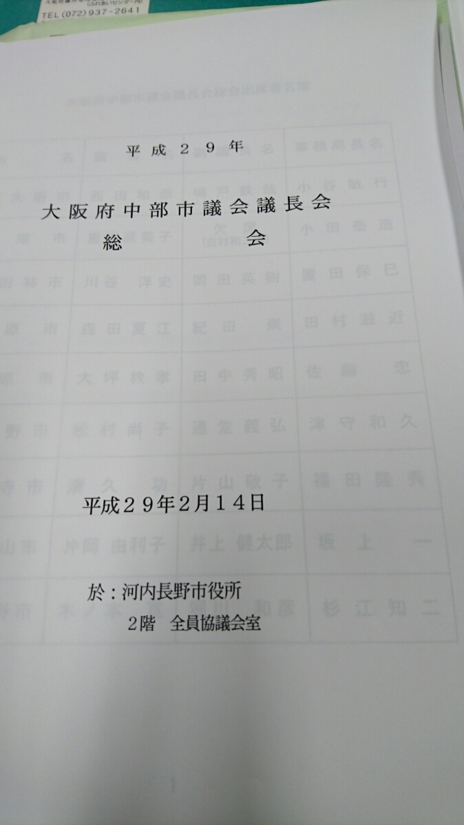 本日大阪府中部市議会参加させて頂きました。。平成29年度大阪府中部市議会議長会会計予算についてを河内長野市役所で行われました。