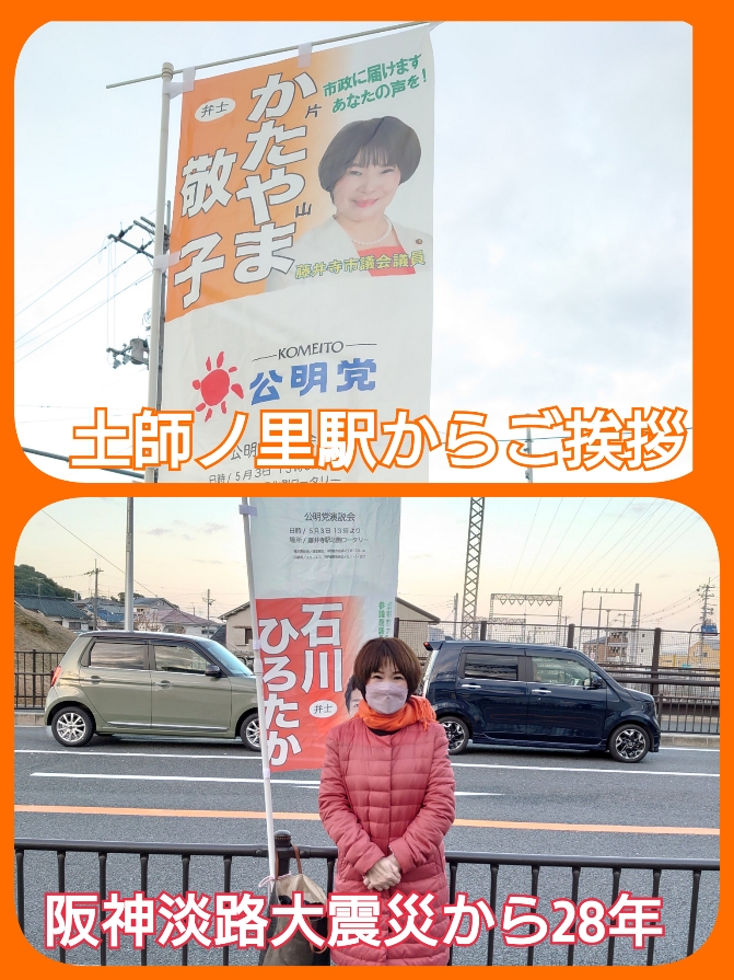 1月17日土師ノ里駅からご挨拶させていただきましてた。本日は阪神淡路大震災から28年。犠牲になられた皆様に哀悼の意を表しますとともに新たに防災、減災に取り組まなければならないと決意をさせていただきました。しっかり教訓をいかして頑張ってまいります。