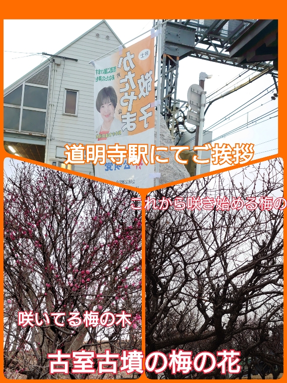 本日1月18日道明寺駅からご挨拶☺️多くの方にお声かけいただきました。今日は曇っているので寒くなりそうです。又コロナウィルスも流行してますので皆様体調に気をつけて下さい。☺️古室古墳の梅の木一本だけ凄く奇麗に咲いてます。まだこれからの咲く梅の木がほとんどです。とても楽しみです。🙋今日も全力で頑張ります。💪