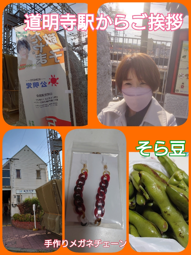 5月11日道明寺駅からご挨拶。皆様のお声かけに感謝します。とれたてそら豆をいただきました。とても美味ししうです。☺️又先日土師ノ里駅で手作りのメガネチェーンをいただきとても使いやすかったです。本当に皆様の真心に感謝です。☺️今日も全力で頑張ります💪💪