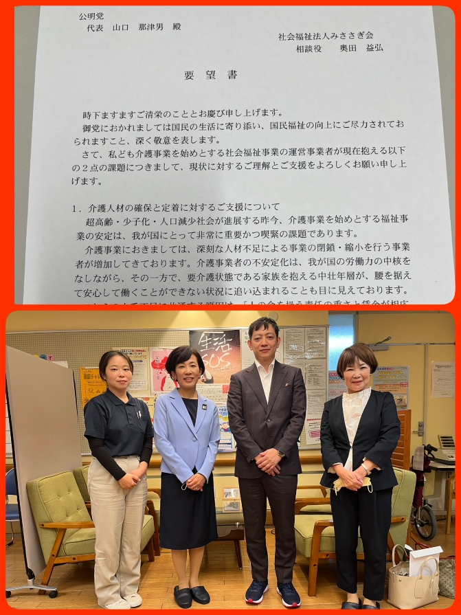 11月6日午前中は消防組合の代表者会へ。午後から山本香苗参議院議員が社会福祉法人みささぎ会様よからのご要望書をお受けするため藤井寺市に来られました。奥田相談役、理事長から、介護人材の確保定着に対する支援、生活困窮者支援に対する制度創設についての要望がありました。みささぎ会様の人を思いやる深い思いに心から感動と感謝をいたしました。