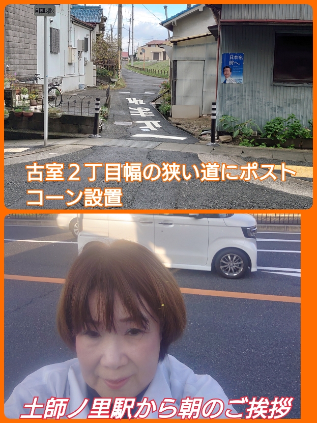 10月17日朝土師ノ里駅からご挨拶させていただきました。皆様からのお声かけありがとうございます😊爽やかな朝で今日はとてもいい天気です。一番いい季節です☺️先日古室の狭い道にポストコーンを設置していただきました。夜中車が狭い道を通りあたりのブロックにあたって怖かったとの声に設置していただきました。これからも皆様のお声にしっかり答えてまいります😊よろしくお願いいたします🙌