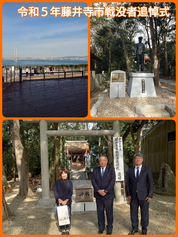 11月16日藤井寺市戦没者追悼式に民生文教常任委員会委員長として伊弉諾神宮に岡田市長、岡本議長藤井寺市遺族会の方と行かせていただきました。先の大戦で亡くなられた方々に追悼の意を表します。今世界で悲惨な紛争でな苦しむ状況の中戦争の恐ろしさを語っていくのは日本の役目であると宮司さんのお言葉がありました。平和はあたりまえではないと心から感じました。しっかりこれからも語ってまいります。